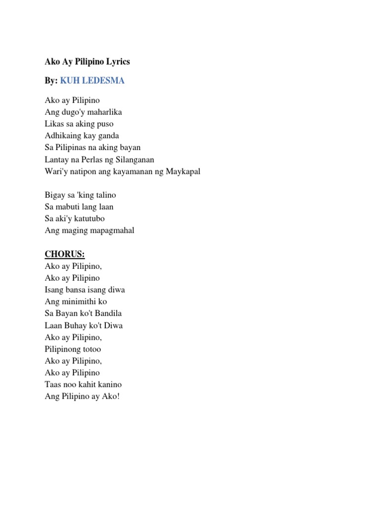 Iniibig ko ang Pilipinas aking lupang sinilangan tahanan ng aking lahi. Lyrics of ako ay pilipino 1. Ako ay Pilipino kaya naman mahal ko ang Pilipinas gayundin ang pambansang wika nito.