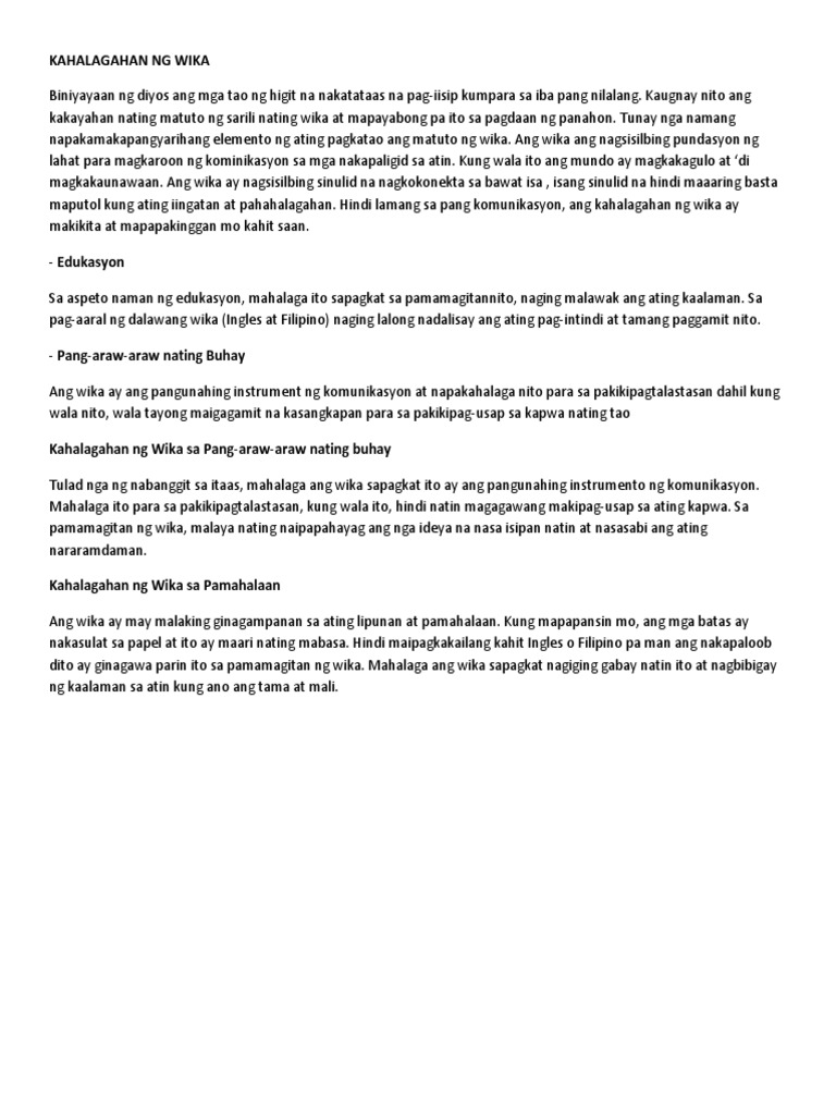 Mahalaga ito para sa pakikipagtalastasan kung wala ito hindi natin magagawang makipag-usap sa ating kapwa. Dress to kill ka mukhang may mahalaga kang lakad. Bukod dito ang pagkakaroon din ng sariling wika ay nakakatulong sa pag-angat ng ekonomiya ng isang bansa.