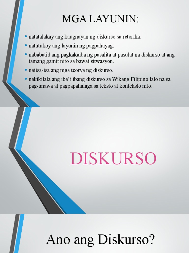 - Ayon sa diksyunaryong ingles-filipino 1984 ang diskurso ay nangangahulugang magsulat o magsalita nang may katagalan o kahabaan. 25062016 Linggo ng Wikang Pambansa Marso 26 1954 Nilagdaan ni Pangulong Ramon Magsaysay ang Proklamasyon Blg 12 na nagpapahayag ng pagdiriwang ng Linggo ng Wika. Ipinagamit ang mga katutubong wika sa pagsulat ng mga akdang pampanitikan.