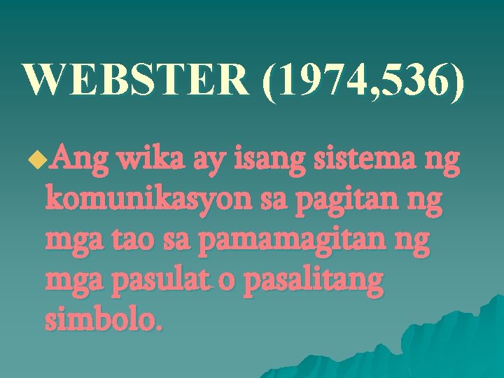 Wikang Swahili atanipena magugustuhan niya ako Wikang. 2Sosyolek 3Idyolek Katangian ng wika 4Varayti at Varyasyon 1Masistemang Balangkas 5Heyograpikal at Sosyal 2nagbabatay sa kultura 6Rejister 3sinasalitang tunog 7Istilo 4arbitaryo 8Domeyn 5wika ay ginagamit. Ayon sa kanya ang wika ay isang masistemang balangkas ng sinasalitang tunog na pinili at isinaayos sa paraang arbitraryo upang magamit ng mga taong kabilang o kasapi sa isang kultura or lipunan.