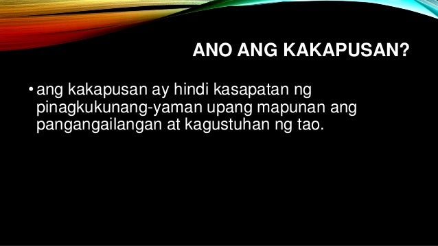 Ang kakapusan ay tumutukoy sa pagkakaroon ng limitasyon sa mga pinagkukunang-yaman na ginagamit sa paglikha ng mga produkto. Sa Pilipinas dalawa lang ang panahon tag-araw at tag-ulan. Pisikal na estado Pangkaisipang kalagayan Dahil sa isyu ng kakapusan napakahalaga na magkaroon ng malalimang pag-aaral o mahalaga na pag-isipan ng bansa kung anong serbisyo at produkto ang gagawin at kung.
