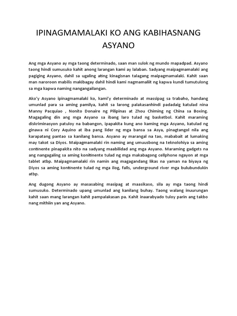 Akoy isang Pilipino ang bayan koy Pilipinas Bansang dulot ng Maykapal sa Silangan napalagak Yaong libu-libong pulo na sa dagat ay nagkalat Sa halik ng mga alon tila perlas ang katulad. Ipinagmamalaki ko rin na akoy isang Asyano dahil ang ma Asyano ay malikhain. Isa pang ipinagmamalaki ko sa ating lahi ay ang pagmamahal natin sa Diyos sa pamilya at sa kapwa natin.